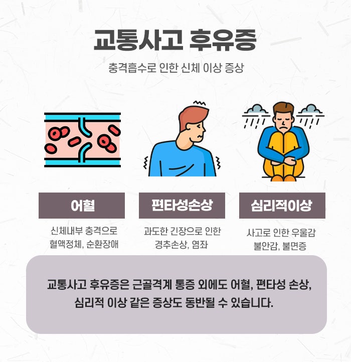 교통사고를 겪은 후 불안감이나 스트레스가 지속적으로 나타날 수 있습니다. 사고 당시의 충격이나 공포로 인해 정신적으로 고통을 겪을 수 있으며, 심리적 후유증이 심각할 수 있습니다.