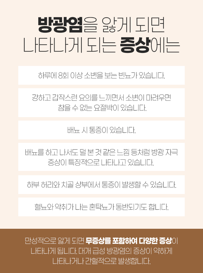 ㅁ 배뇨를 하고 나서도 덜 본 것 같은 느낌이 드는 등 방광 자극 증상이 특징적으로 나타나고 있습니다.