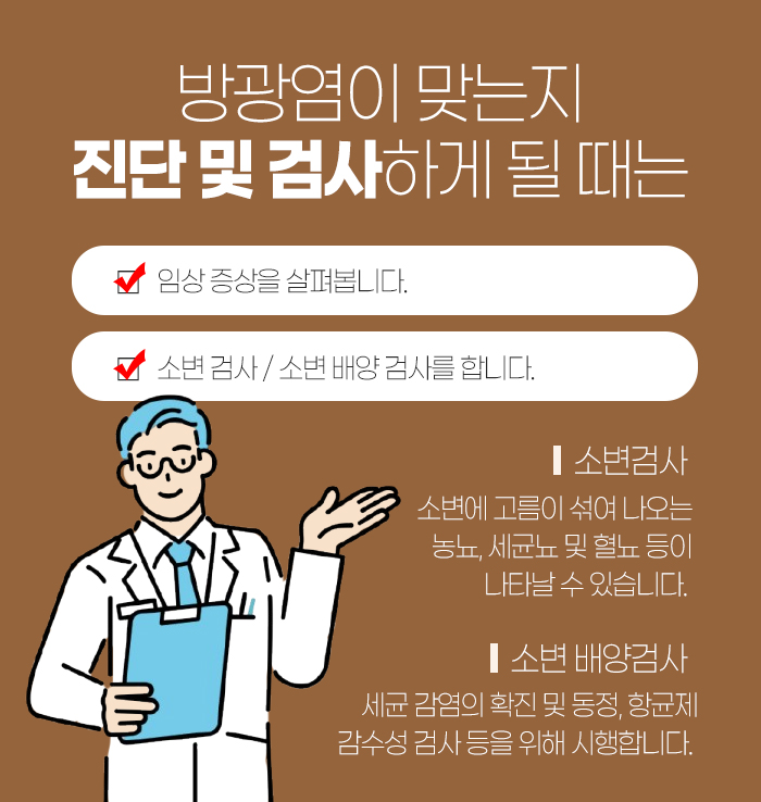 또 방광염이 맞는지 진단을 하게 될 때는 임상 증상을 살펴보거나 소변 검사 및 소변 배양 검사를 진행하게 되는데요. 소변 검사는 고름이 섞여 나오는 농뇨나 세균노, 혈뇨 등이 나타날 수 있으며 소변 배양검사는 세균 감염 확진 등을 할 수 있습니다.