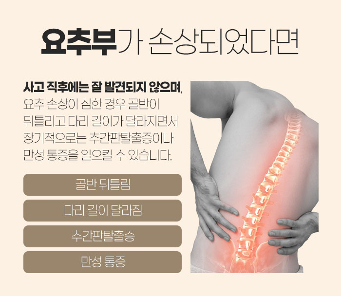 그러다 보니 갑작스럽게 당한 교통사고 후유증으로 인해 요추부나 경추부가 손상되었을 때 원주한의원으로 내원하여 추나요법 등으로 도움을 받으시는 경우도 많답니다. 이에 대한 예로 요추부 손상을 얘기해보자면 교통사고로 인해 외부에서 충격을 크게 받게 될 경우 심하면 골반이 틀어지거나 다리 길이가 달라지고, 또 장기적으로는 추간판탈출증이나 만성 통증을 일으키게 될 수 있습니다.