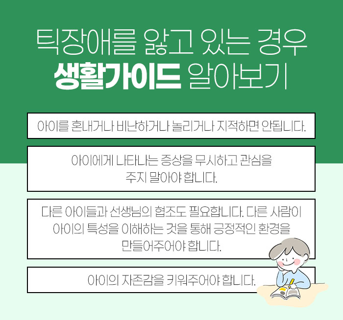 이때 자신도 모르게 이러한 증상이 나타나는 것을 혼내는 등으로 아이를 다그쳐 고치고자 하시는 분들이 있는데요. 이러한 틱장애는 뇌의 기능이상으로 생기는 것인 만큼 다그친다고 해서 나아지지 않으며, 오히려 상태를 악화시킬 수 있습니다.