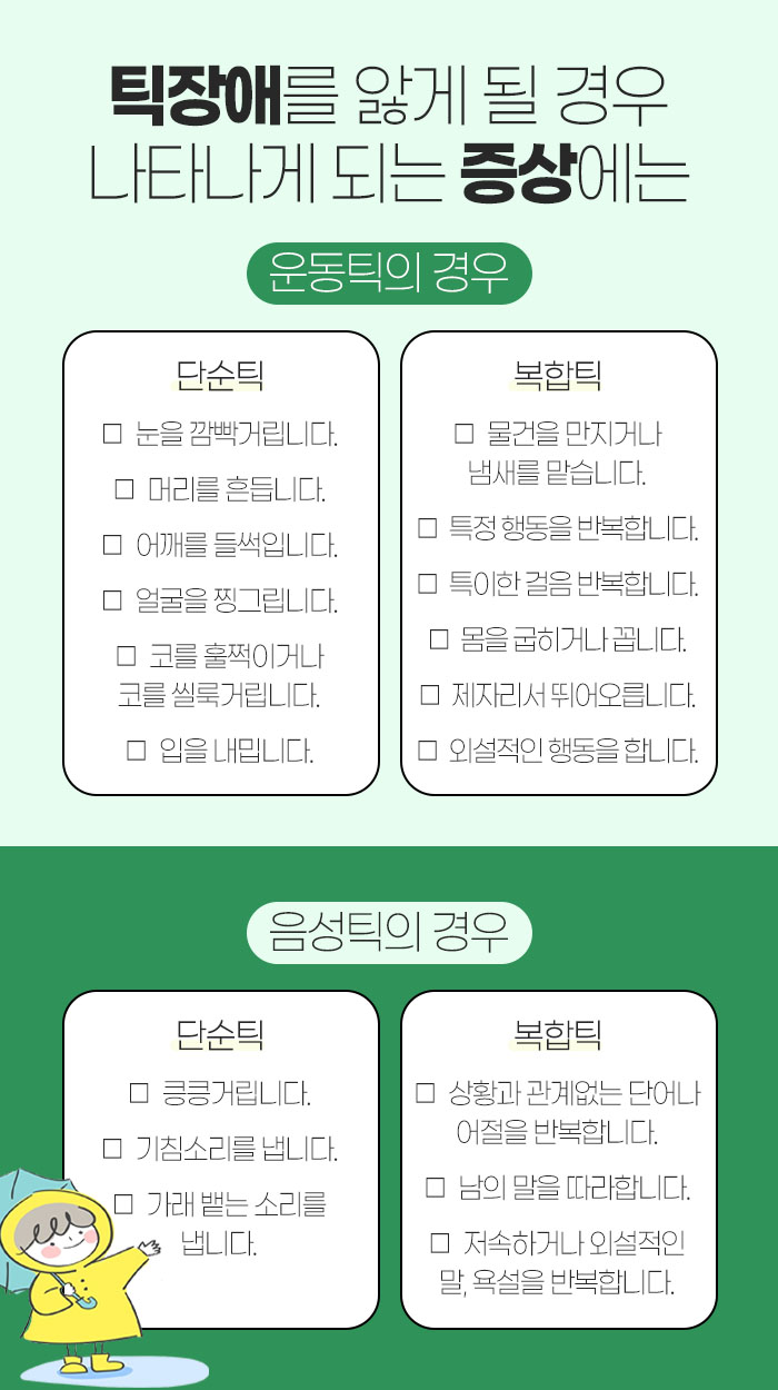 그리고 틱장애가 발생하는 경우 3~7세 무렵에 시작되면서 호전과 악화를 반복한답니다. 그러다 10~12세 사이에 증상이 가장 심해지게 되는데요. 이때 사춘기를 거치면 점점 완화되는 양상을 보이고, 또 청소년기가 끝나가거나 성인기가 되었을 때 60~80%는 낫거나 증상이 현저히 감소하게 된ᄃᆞᆸ니다.