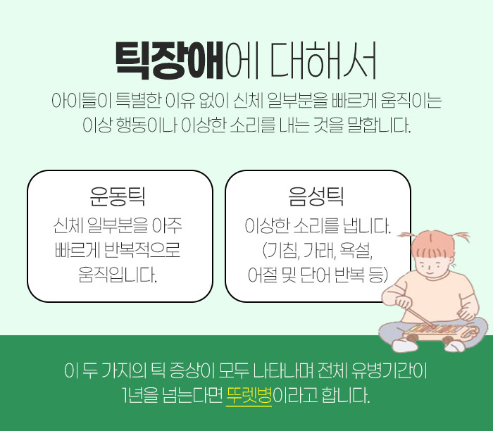 그리고 틱장애라고 하더라도 운동틱인지 음성틱인지, 단순틱으로 나타나고 있는지 복합틱으로 나타나고 있는지 저마다 다른데요. 운동틱은 신체의 일부분을 아주 빠르게 반복적으로 움직이는 것을 말하고, 음성틱은 이상한 소리를 내게 되는 것을 말한답니다.