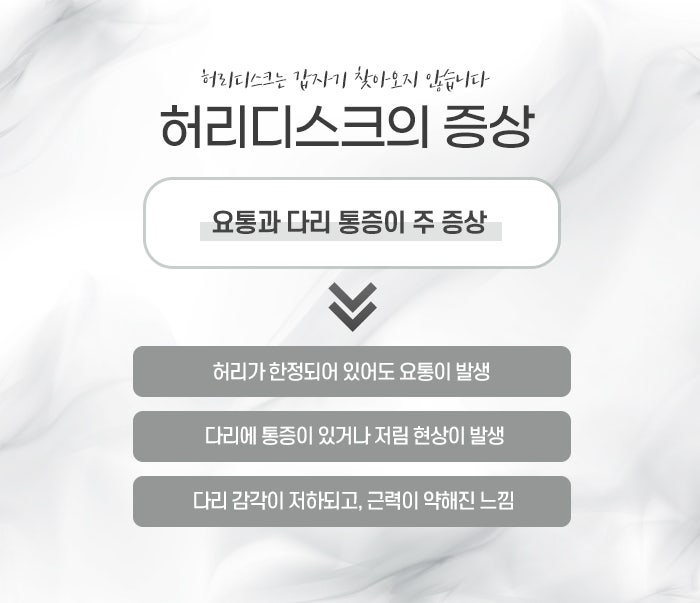 허리디스크는 척추 뼈 사이에 있는 디스크가 제자리를 벗어나거나 터져서 신경을 압박하게 되는 질환으로, 허리 통증, 다리 저림, 힘 빠짐 등 다양한 증상을 유발합니다. 디스크는 척추뼈와 척추뼈 사이에서 충격을 흡수하고, 운동을 원활하게 하는 역할을 합니다. 하지만 과도한 압박이나 부상, 잘못된 자세 등이 지속되면 디스크가 탈출하거나 파열되면서 주변 신경을 압박하게 됩니다. 그 결과 허리 통증, 다리 통증, 저림 증상, 심한 경우 다리 마비까지 발생할 수 있습니다. 대부분의 사람들이 허리디스크라고 할 때 흔히 떠올리는 증상은 허리가 아프거나 다리나 발에 저린 느낌을 받는 것이라고 원주허리디스크치료한의원에서는 말합니다.