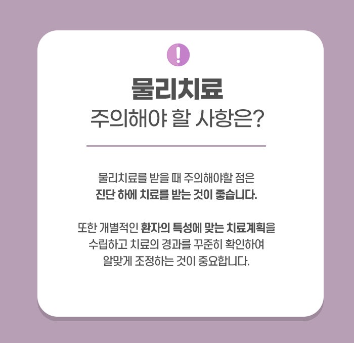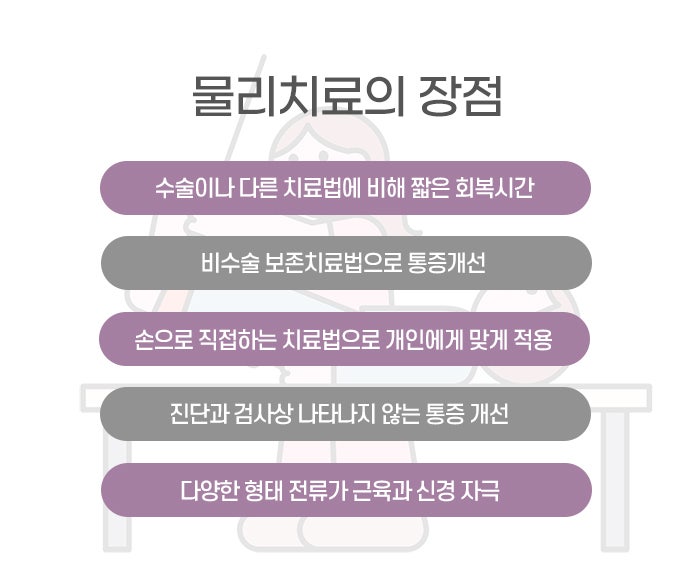 물리치료는 단순히 통증 개선을 넘어, 장기적인 기능 회복과 기능 저하 방지를 목표로 하여 환자가 일상생활에서 겪을 수 있는 불편함을 최소화하고, 더 나은 삶의 질을 추구하는 데 큰 기여를 합니다. 물리치료는 근골격계 질환의 치료뿐만 아니라 예방과 관리에서도 중요한 역할을 합니다. 비침습적인 방법으로 자기 회복을 돕는 물리치료는 환자들에게 장기적인 회복과 예방을 가능하게 합니다.