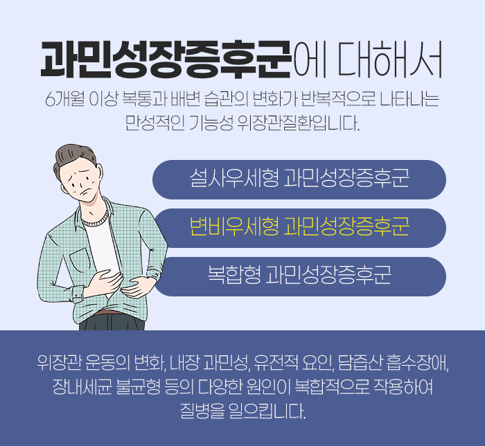 그리고 과민성장증후군에 대해 자세히 살펴보자면 6개월 이상 복통과 배변 습관의 변화가 반복적으로 나타나게 되는 만성적인 기능성 위장관질환을 말합니다. 이러한 과민성장증후군은 변비우세형이 있고 설사우세형이 있습니다. 또 복합형이 있는데요.