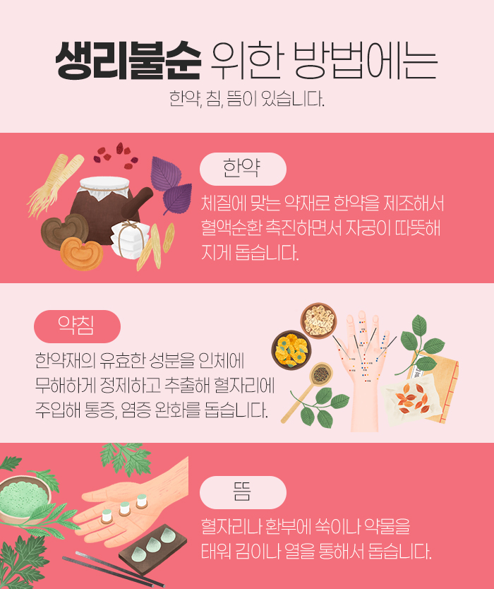 덧붙여 이러한 생리불순으로 인해 무실동공휴일한의원을 찾게 된다면 한약과 침, 뜸을 통해 도움을 받게 되는데요. 한약은 체질이 맞는 약재로 한약을 제조해서 혈액순환을 촉진시키며 자궁이 따뜻해지게 하는데 돕습니다. 또 침은 혈자리에 주입하는 것을 통해 통증과 염증을 완화시키는데 도움을 주고, 뜸은 혈자리 등에 쑥이나 약물을 태워서 김이나 열을 통해 돕는답니다.
