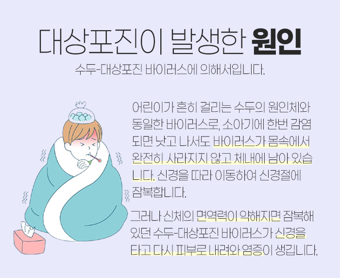 어린아이일 때 수두에 걸리는 경우가 많은데, 수두에 걸리고 난 후 낫고 난 후 바이러스가 완전히 사라지게 되는 것이 아니라 몸속에 남아 있게 됩니다. 그리고 신경을 따라서 신경절에 잠복하게 되는데요. 그 후 신체의 면역력이 약해지게 되면 잠복해 있던 수두 대상포진 바이러스가 신경을 타고 다시 피부로 내려오게 되면서 염증이 생기게 되는 것이랍니다.
