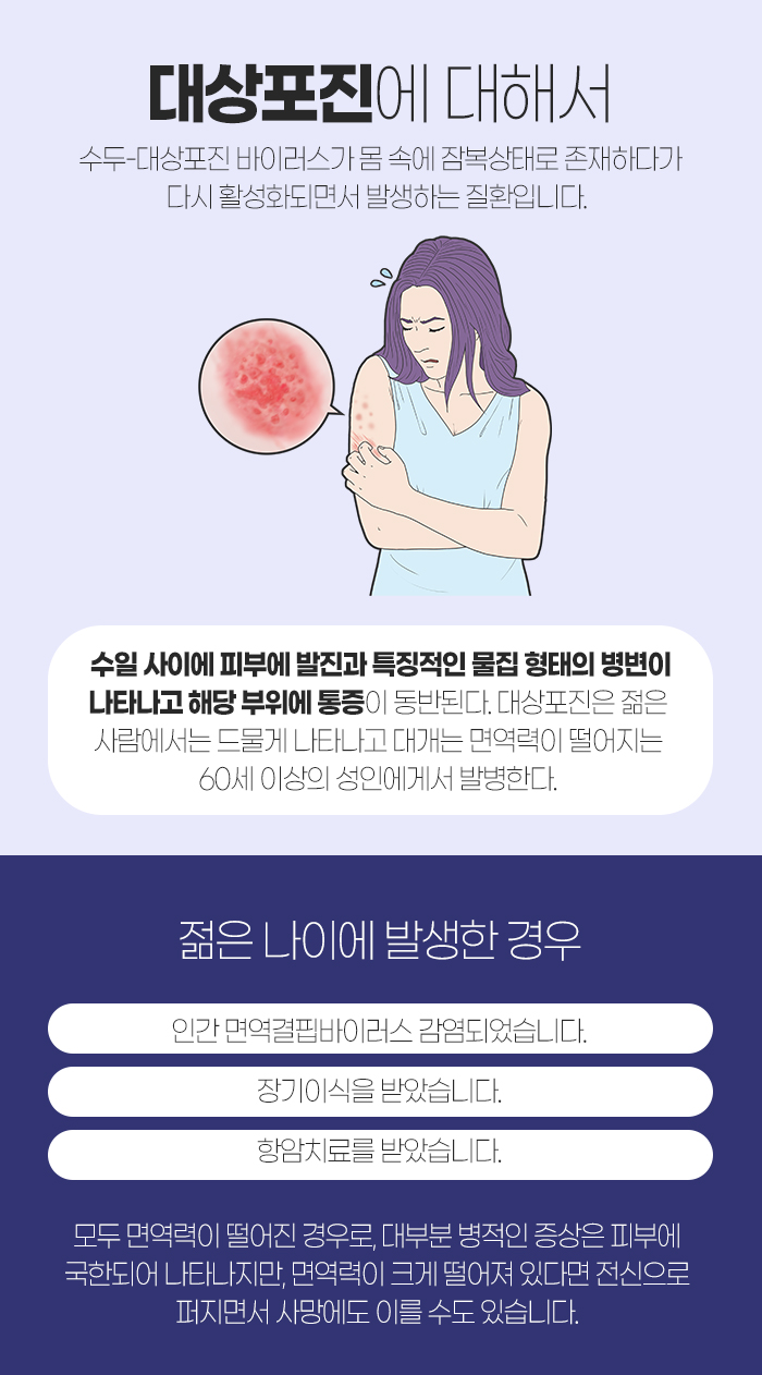 이러한 대상포진은 젊은 사람에게 드물게 나타나며 보통은 면역력이 떨어지는 60세 이상의 성인에게 나타나는 경우가 많습니다. 그리고 젊은 나이에도 대상 포진이 발생하는 경우는 그만큼 면역력이 떨어져 있는 상태인데요.
