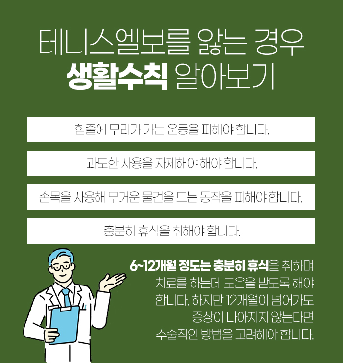 그리고 음식 섭취에 대해서 문의주시는 분들이 많은데요. 음식 섭취에 대한 내용은 따로 없으며, 상과염이 있는 경우에는 근육이 충분히 쉴 수 있도록 해주는 것이 좋습니다. 또 지나치게 사용하거나 부하가 가해지는 것, 반복적으로 사용하는 것을 피해주시는 게 좋다고 다시 한번 말씀드리고 싶습니다.
