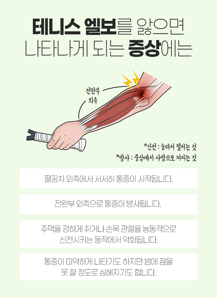 - 팔꿈치 외측에서 서서히 통증이 시작됩니다.