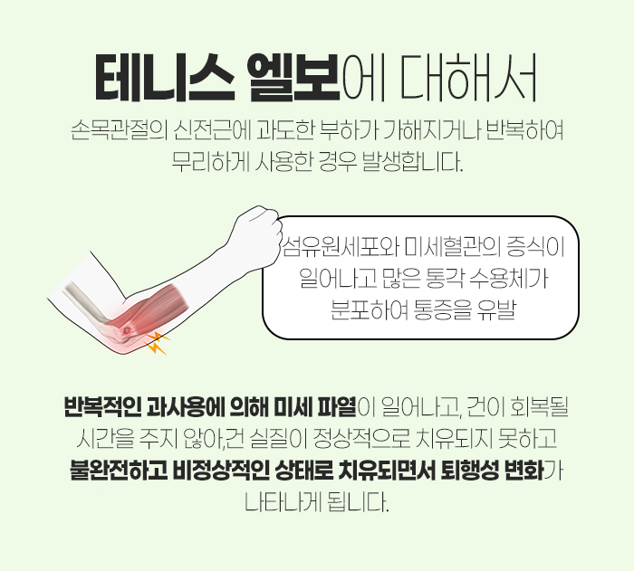 이러한 테니스 보는 손목 관절의 신전근에 과도하게 부하가 발생하거나 반복하여 무리하게 사용하게 되면서 발생하게 되는데요. 반복적인 과사용에 의해 미세파열이 일어나게 되고, 건이 회복될 시간을 주지 않아 건 실질이 정상적으로 치유되지 못하고 불안전하고 비정상적인 상태로 치유되면서 퇴행성 변화가 나타나게 되어 발생하게 되는 것이랍니다.