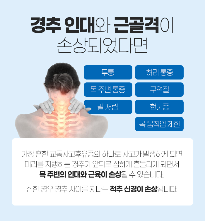 그래서 경추 인대와 근골격 손상으로 목 주변의 통증과 목 움직임 제한, 두통, 허리 통증, 구역질, 팔 저림, 현기증 등의 증상 을 호소하시는 분들이 많답니다.