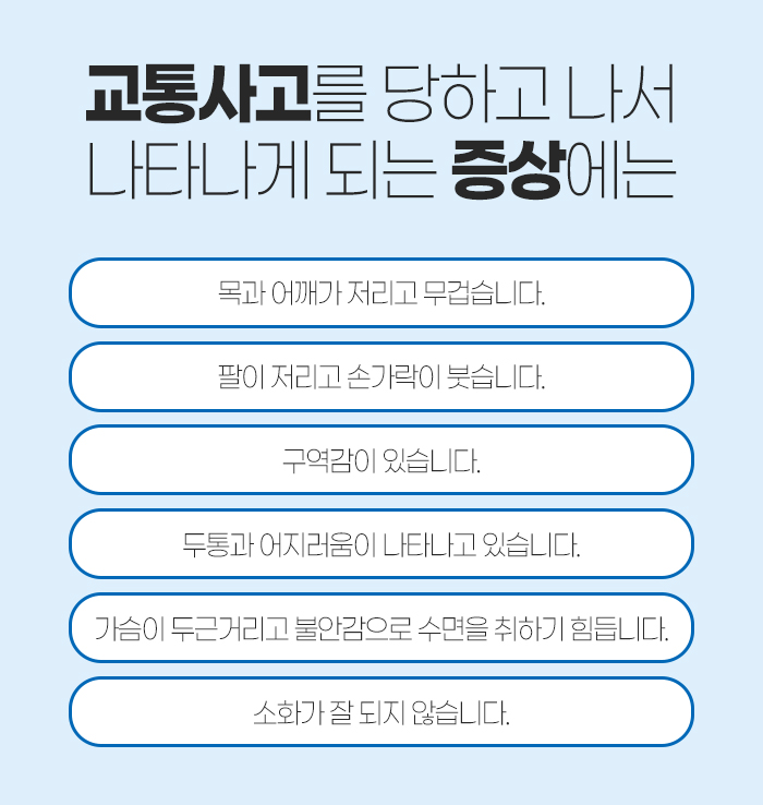 그리고 이렇게 교통사고를 당하게 되면 나타나게 되는 후유증 증상은 다음과 같은데요.