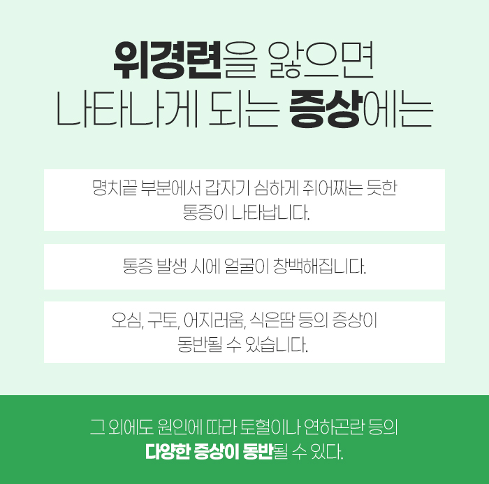 이 외에도 어떤 원인으로 위경련이 발생하게 되었는 지에 따라서 토혈이나 연하곤란 등의 다양한 증상이 동반될 수 있는데요.