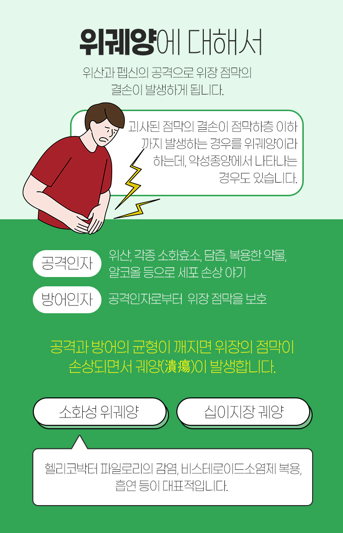 평소 위는 위산과 각종 소화효소, 담즙, 약물, 알코올 등 세포 손상을 야기하는 공격인자로부터 위장 점막을 보호하는 방어인자의 도움을 받지만 공격인자와 방어인자의 균형이 깨지게 되면 위장 점막이 손상되면서 궤양이 발생하게 된답니다.