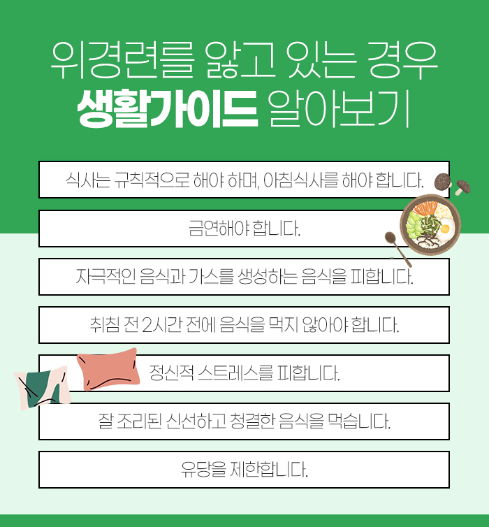 식사는 규칙적으로 해야 합니다. 특히 아침 식사는 꼭 거리지 말고 챙겨 드시는 게 중요한데요. 이는 위장이 오랜 시간 동안 빈 상태로 있게 되면 위산의 농도가 증가하게 되면서 궤양이나 염증이 악화되기 때문이랍니다.