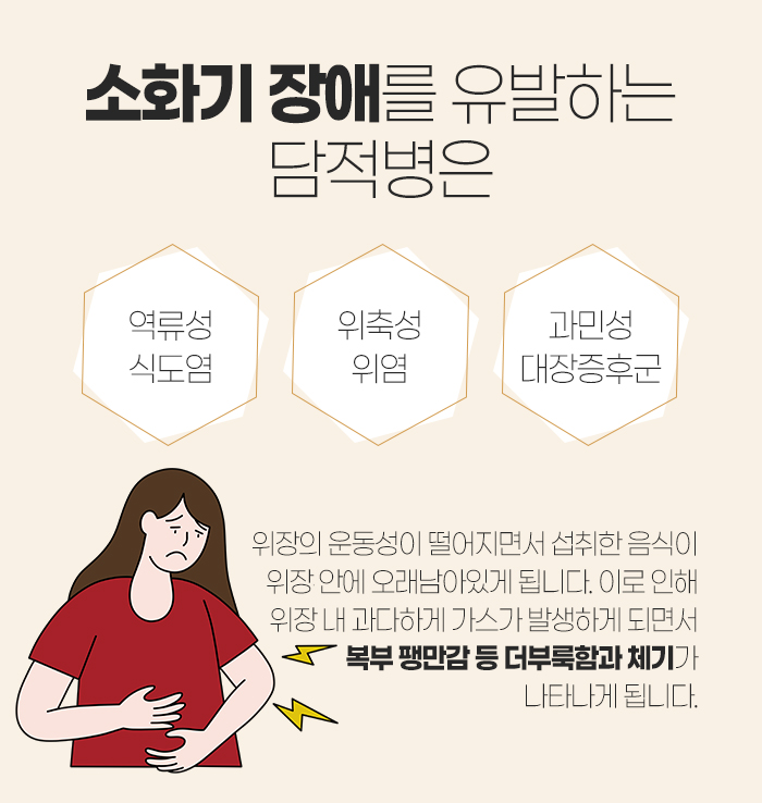 그리고 담적병은 소화기장애를 유발시키는데요. 이로 인해 역류성 식도염이나 위축성 위염, 과민성 대장증후군이 발생하게 될 수 있답니다. 이는 위장의 운동성이 떨어지면서 섭취한 음식이 위장 안에 오래 남아 있게 되기 때문인데요. 그래서 위장 내에 과도하게 가스가 발생하게 되면서 복부 팽만감 등 더부룩함과 체기가 나타나게 되는 것이랍니다.