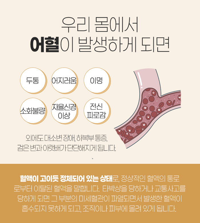 이렇게 어혈이 발생하게 되면 혈액순환에 지장이 생기게 되면서 두통, 어지러움, 이명, 소화불량, 자율신경 이상, 전신 피로감, 대소변 장애, 하복부 통증 등의 증상이 나타나게 된답니다. 그대로 놔둔다고 해서 자연히 나아지지 않으며 오히려 몸의 상태가 악화될 수 있는 만큼 원주주말진료한의원 등에서 어혈을 제거하는데 도움을 받고자 하시는 경우가 많답니다.