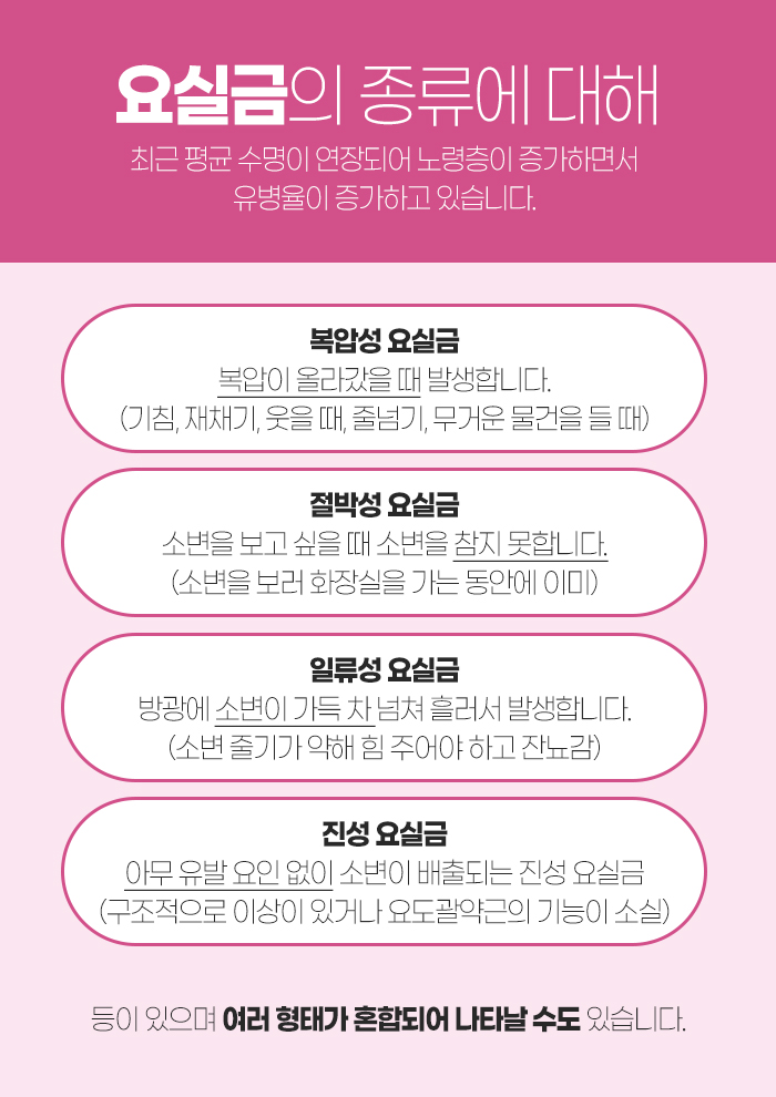 또 절박성 요실금은 소변을 보고 싶을 때 소변을 참지 못하게 되는 것을 말하는데요. 보통 소변을 보기 위해 화장실을 가는 동안 이미 소변이 나오게 된답니다. 그리고 일류성 요실금은 방광에 소변이 가득 차 넘쳐 흘러서 발생하게 된답니다. 이런 경우 소변 줄기가 약해서 소변을 볼 때 힘을 주어야 나오는 경우가 많은데요. 소변을 보고 나서도 개운하지 않은 잔뇨감을 느끼게 된답니다.