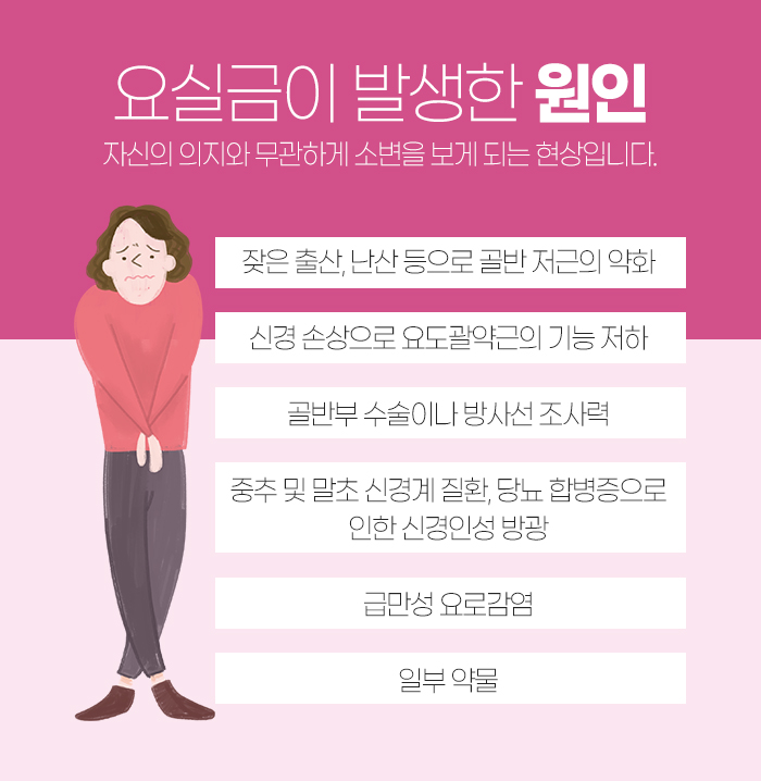 그래서 요실금에 대해 알아보자면 발생하게 되는 원인이 무척 다양하답니다. 잦은 출산 및 난산 등으로 인해 골반 저근이 약화되면서 발생하기도 하고, 신경이 손상되면서 요도관약근의 기능이 저하되어 발생하기도 합니다.