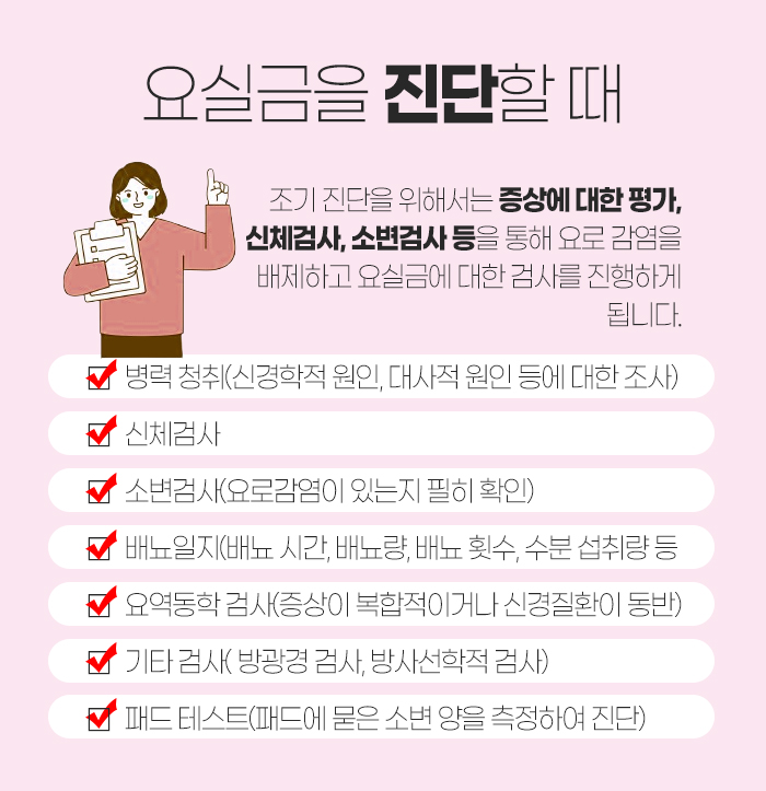 그리고 아직 요실금에 대해서 진단을 받지 않은 분들을 위해 말씀드리자면 증상에 대한 평가와 신체 검사, 소변 검사, 배뇨일지, 요역동학 검사, 방광경 검사, 방사선학적 검사, 패드 테스트 등을 진행하게 된답니다.