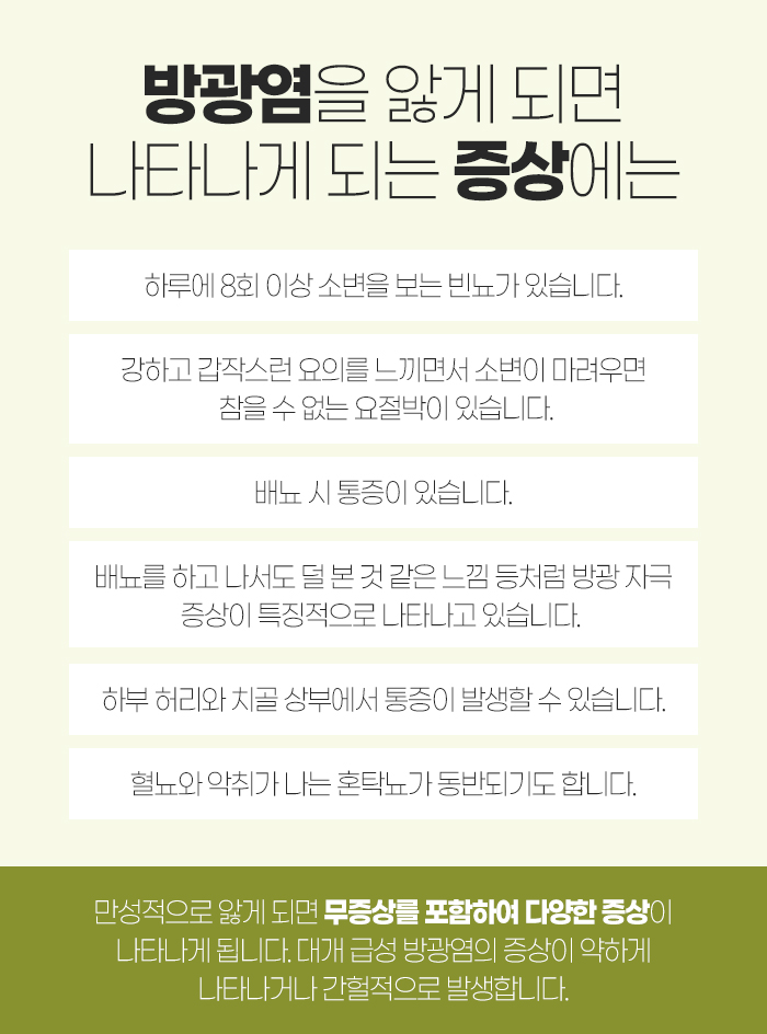 ㅁ 배뇨를 하고 나서도 덜 본 것 같은 느낌이 들고 방광 자극 증상이 특징적으로 나타나고 있습니다.