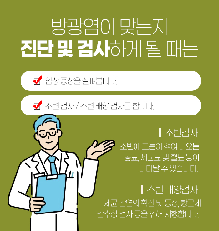 이렇게 방광염에 대해 진단 및 검사를 하게 될 때는 임상 증상에 대해 살펴보게 되고 소변 검사나 소변 배양 검사를 진행하게 되는데요. 소변 검사는 소변에 고름이 섞여 나오는 농뇨, 세균뇨 및 혈뇨 등이 나타날 수 있답니다. 또 소변 배양 검사는 세균 감염의 확진 및 동정, 향균제 감수성 검사 등을 위해 시행하게 되는데요.