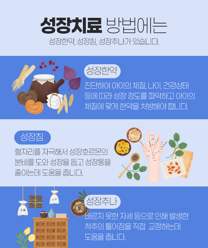 그리고 성장한약 외에도 성장침과 성장 추나가 있는데요. 성장침은 혈자리를 자극해서 성장 호르몬의 분비를 도와 성장을 도우며 성장통을 줄이는데 도움을 주는 역할을 한답니다.