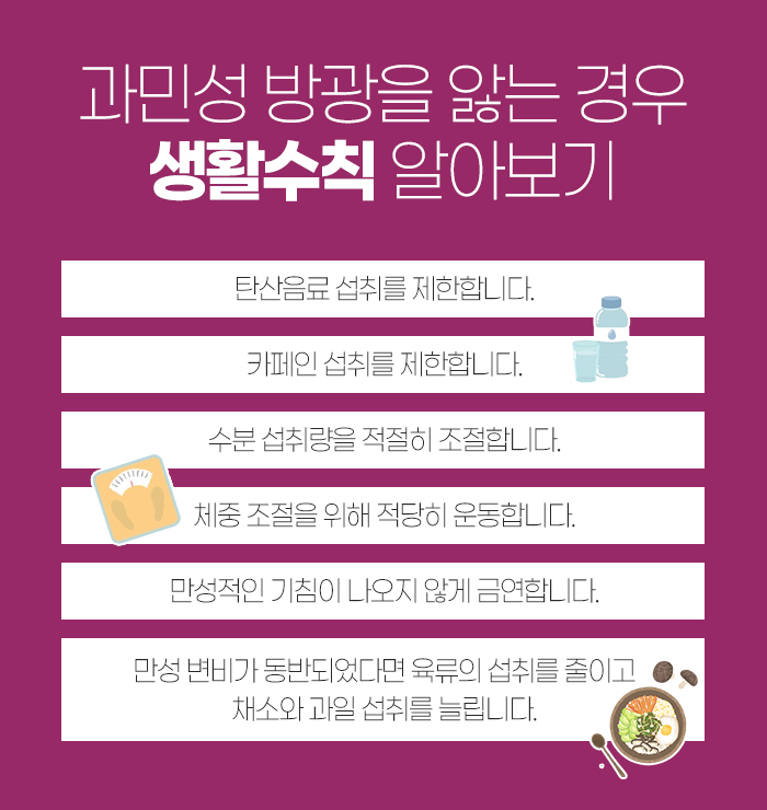이를 테면 탄산 섭취와 카페인 섭취를 제한하도록 해야 합니다. 또 수분 섭취를 적절히 해야 하는데요. 체중 조절을 위해서 적당히 운동해야 하고, 만성적인 기침이 나오지 않도록 금연해야 한답니다. 그리고 만성적인 변비가 동반되어 있는 경우에는 육류 섭취를 줄이면서 채소와 과일 섭취를 늘리도록 해야 합니다.