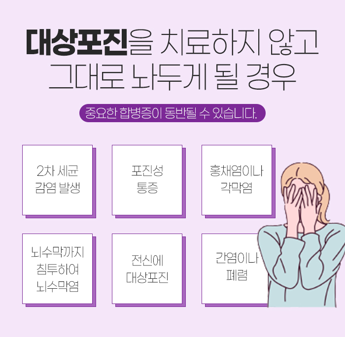 이러한 대상포진을 치료하지 않고 그대로 놔둘 경우 2차 세균감염이 발생하면서 곪을 수 있습니다. 또한 노인분이나 면역억제 환자분의 경우 피부 이상 증상이 좋아져도 포진성 통증이 남는 경우가 흔합니다. 또 면역기능이 정상인 환자분의 경우도 7.9%에서 포진성 통증이 나타날 수 있는데요다. 만약 눈 주변에 생겼다면 홍채염이나 각막염을 일으켜 실명할 수 있고, 바이러스가 뇌수막까지 침투할 경우에는 뇌수막염으로 진행될 수 있습니다.
