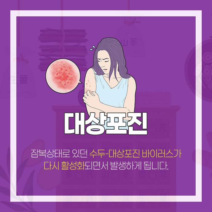 하지만 신체의 면역력이 약해지게 되면 잠복해 있던 수두 대상포진 바이러스가 신경을 타고 다시 피부로 내려오게 되면서 염증이 생기게 되는데요.