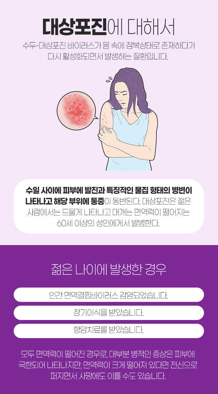 이러한 대상포진은 젊은 사람에게 드물게 나타나며 보통 면역력이 떨어지는 60세 이상의 성인에게 나타나는 경우가 많습니다. 하지만 그렇다고 젊은 사람에게 아예 나타나지 않는 것은 아닌데요.