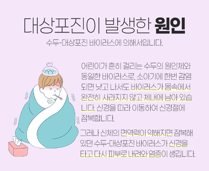 그리고 도대체 왜 대상포진이 발생하게 된 건지 의아하고 답답하신 분들 계실 텐데요. 이에 대해 말씀드려보자면 대상포진은 어린이가 흔히 걸리는 수두의 원인체와 동일한 바이러스입니다. 소아기에 한 번 감염되어 낫고 난 후 바이러스가 몸속에서 완전히 사라지지 않고 체내에 남아 있게 되는데요. 이때 신경을 따라 이동해서 신경절에 잠복하게 된답니다.