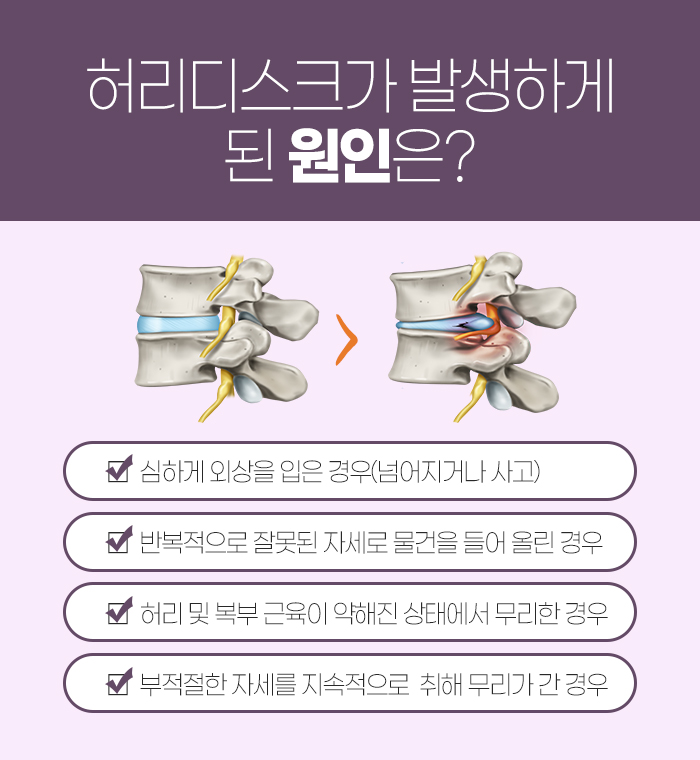 그리고 허리디스크가 발생하게 되는 이유는 여러 가지가 있는데요. 넘어지거나 사고를 당하는 등 심하게 외상을 입었거나 반복적으로 잘못된 자세로 물건을 들어 올리면서, 허리 및 복부 근육이 약해진 상태에서 무리해서, 부적절한 자세를 지속적으로 취해 무리를 하게 되면서입니다. 이처럼 허리디스크는 여러 가지 원인에 의해 발생하게 되는 것을 알 수 있는데요.