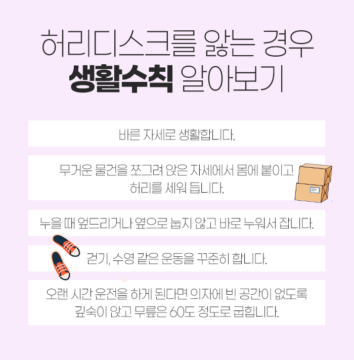 또 누울 때 엎드리거나 옆으로 눕지 않고 바로 누워서 자야 하는데요. 이 외에도 걷기나 수영 같은 운동을 꾸준히 해야 합니다. 그리고 오랜 시간 운전을 하게 될 때는 의자에 빈 공간이 없도록 깊숙이 안고 무릎을 60도 정도로 굽혀야 한답니다.