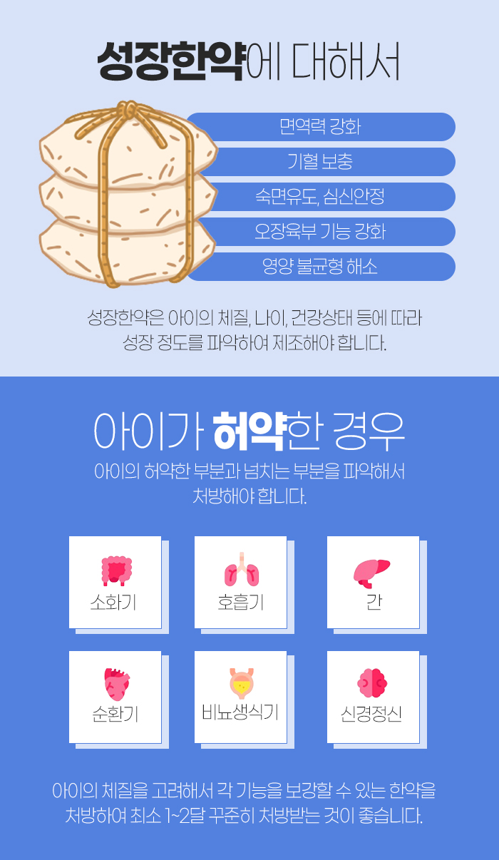 이때 중요한 것은 바로 아이의 허약한 부분과 넘치는 부분에 대해 파악하여 차방해야 한다는 것입니다. 각 기능을 보강할 수 있는 한약을 처방하여 최소 1~2달 꾸준히 처방받도록 해야 하는데요. 이를 통해 소화기나 호흡기, 간, 순환기, 비뇨생식기 등에 도움을 받을 수 있습니다.