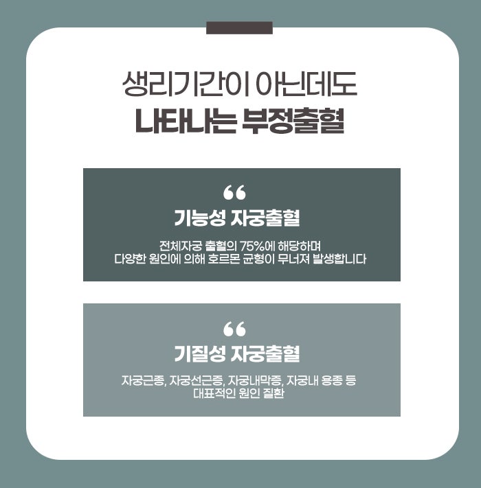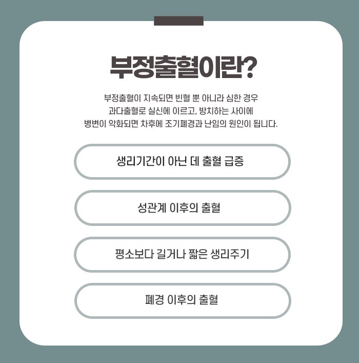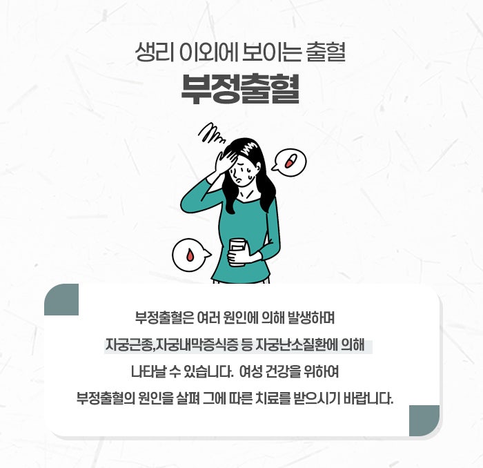 부정출혈은 월경 주기와 상관없이 비정상적인 출혈이 발생하는 상태로, 일반적으로 생리 주기 외에 출혈이 있을 때 이를 부정출혈이라고 부릅니다. 여성의 생리 주기는 호르몬의 영향을 받아 규칙적으로 이루어지는데, 이러한 호르몬의 변화나 다른 신체적 요인들이 영향을 미쳐 생리 주기 외에도 출혈이 일어날 수 있습니다. 부정출혈은 단순한 생리 주기의 불규칙성을 넘어서, 때때로 심각한 질병의 징후로 나타날 수 있기 때문에 이를 방치하지 않고 정확한 원인 파악과 적절한 치료가 필요하다고 무실동한의원에서는 설명합니다.