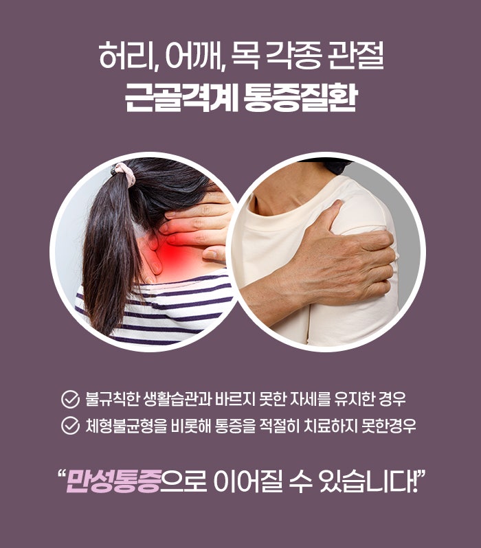 퇴행성 디스크 질환은 특히 목, 허리에서 흔하게 나타나며, 디스크가 점차적으로 수분을 잃고 압박을 받게 되어 신경을 자극합니다. 이러한 변화는 통증, 마비, 운동 제한 등의 증상을 유발할 수 있습니다. 잘못된 자세는 근골격계 질환을 유발하는 가장 흔한 원인입니다. 현대인의 대부분은 오랜 시간 동안 컴퓨터 작업이나 스마트폰 사용으로 구부정한 자세를 유지하게 됩니다. 또한, 불균형한 운동, 과도한 스트레스, 무리한 운동 등이 근골격계에 악영향을 미칩니다. 거북목, 일자목, 디스크 탈출증, 허리 통증 등은 잘못된 자세에서 비롯되는 대표적인 질환입니다. 이러한 잘못된 자세는 관절과 근육에 불필요한 압력을 가하고, 시간이 지날수록 만성적인 통증이나 불편함을 초래할 수 있다고 원주한의원추천 한의원에서는 말합니다.