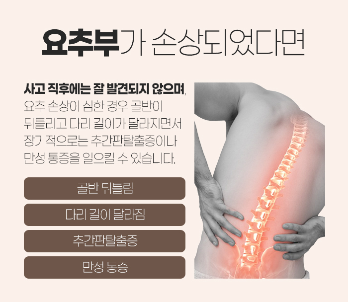 여기서 요추부 손상이 심한 경우에는 골반이 뒤틀리고 다리 길이가 달라지면서 장기적으로는 추간판 탈출증이나 만성 통증을 일으키게 될 수 있는데요. 그렇기에 통증이 나타났을 때 꾹 참고 버티는 것이 아니라 빠른 시일 내에 치료를 하는데 도움을 받으시는 것이 좋습니다.