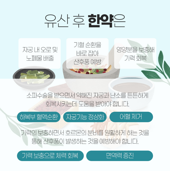 약해진 자궁과 난소를 튼튼하게 해서 회복시키는데 도움을 주는 것을 통해 하복부의 혈액순환과 자궁기능 정상화, 어혈 제거를 도움받으실 수 있습니다. 그리고 기력을 보충하면서 호르몬의 분비를 원활하게 하고 산후풍이 발생하는 것을 예방할 수 있는데요. 이로 인해 체력이 회복되는 것은 물론 면역력 증진에도 도움을 받을 수 있답니다.