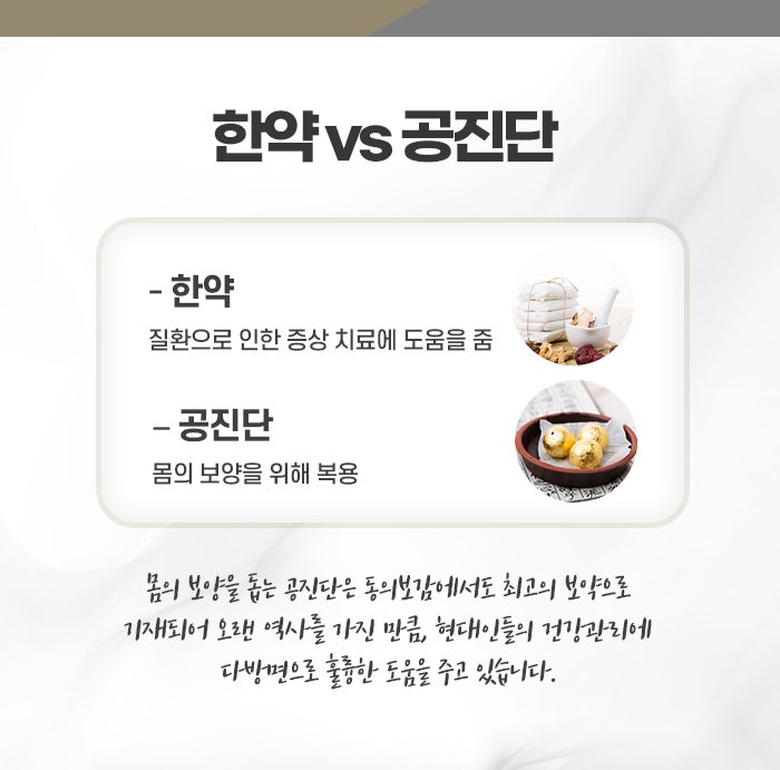 단순한 보약이 아닌 몸 전체의 기능을 조화시키고 장기적인 건강 유지를 돕는 명약인 만큼, 개인의 체질과 건강 상태를 고려한 복용이 중요합니다. 적절하게 활용한다면, 공진단은 삶의 질을 높이고 활력을 회복하는 데 있어 매우 유익한 선택이 될 수 있습니다.