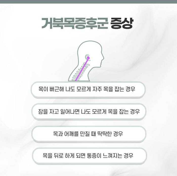 경추와 어깨 주변의 근육이 약하면 올바른 자세를 유지하기 어렵고, 자세를 지지하는 근육의 지구력과 안정성이 떨어지면서 무의식적으로 자세가 무너지게 됩니다. 나아가 불편한 의자나 책상, 낮거나 높은 베개, 잘못된 수면 자세, 차량 운전 중 장시간 목을 앞으로 내미는 습관 등도 거북목을 유발하는 생활 속의 환경적 요인들이라고 원주거북목한의원에서는 강조합니다. 거북목의 증상은 단순히 목이 앞으로 나온 형태로만 나타나지 않습니다. 가장 흔한 증상은 목의 뻐근함, 통증, 긴장감이며, 시간이 지나면서 어깨와 등, 날개뼈 사이에까지 통증이 확산되기도 합니다. 특히 뒷목이 무겁거나, 두통이 자주 발생하며, 심한 경우에는 팔의 저림이나 감각 이상, 집중력 저하, 수면 장애로 이어지기도 합니다. 이는 목뼈 주변의 근육이 과도하게 긴장하면서 신경과 혈관이 눌리기 때문입니다. 또한 목과 어깨를 지탱하는 승모근이 과도하게 활성화되면서 만성적인 어깨통증, 목 어깨 결림 증상이 동반되고, 근육 불균형으로 인해 머리가 한쪽으로 기울거나 척추 측만이 동반될 수도 있습니다.