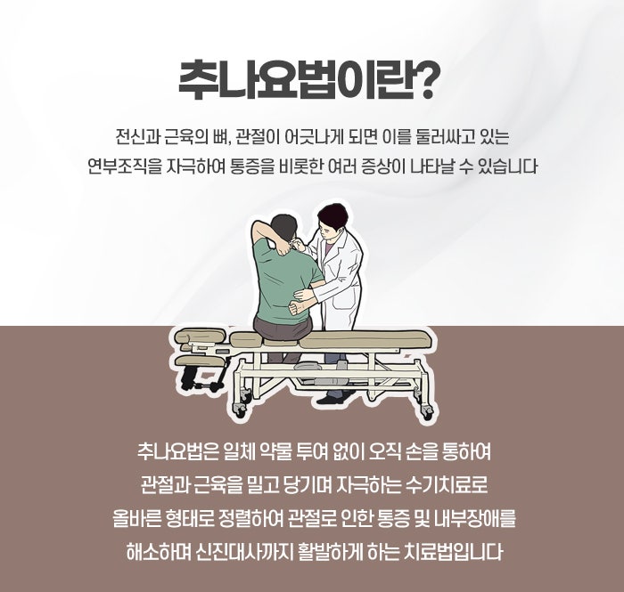 추나요법은 한의학적 전통을 기반으로 한 수기요법 중 하나로, 손이나 신체 일부를 이용하여 환자의 관절, 근육, 인대, 척추 및 전신 구조를 밀고 당기고 돌리는 등 다양한 방식으로 조작함으로써 신체의 구조적, 기능적 불균형을 바로잡고 통증을 개선하며 몸의 균형을 회복하도록 돕는 치료 방법입니다. 전통적으로는 한의사의 숙련된 손 기술을 통해 신체의 기혈순환을 도우면서 근골격계의 균형을 잡아주는 방식으로 발전되어 왔으며, 최근에는 현대 해부학, 생리학, 정형의학의 개념을 접목시켜 보다 과학적이고 체계적으로 발전해온 치료법이라고 원주추나치료한의원에서는 말합니다.