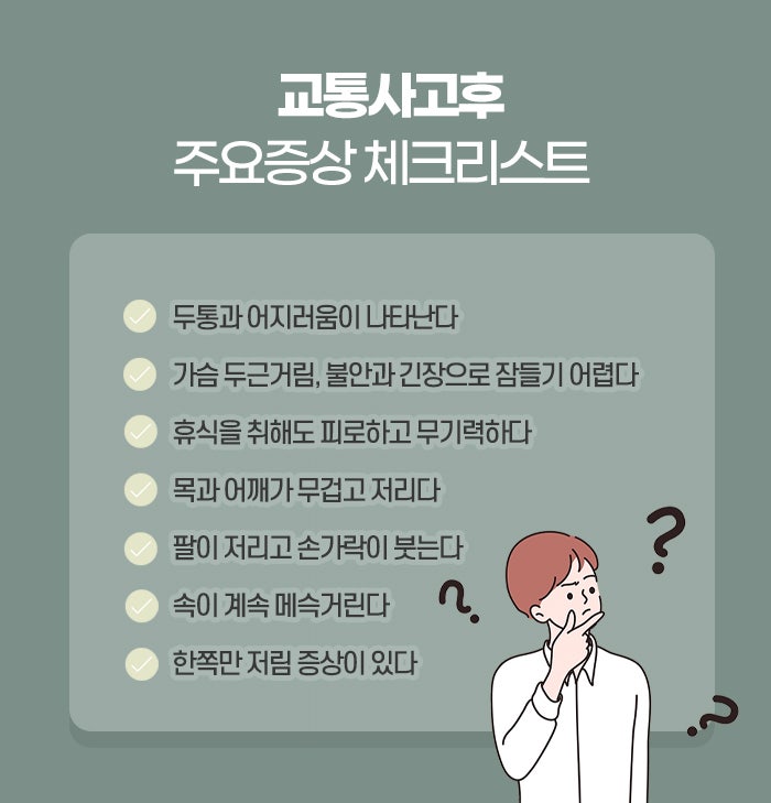건강을 유지하려는 작은 노력들이 결국에는 큰 결과로 돌아오며, 무엇보다 중요한 것은 자신에게 맞는 치료와 관리를 통해 회복의 길을 찾는 것입니다. 교통사고 후 겪는 고통이나 불편함이 시간이 지나면서 점차 개선되고, 다시 건강한 일상을 되찾을 수 있다는 희망을 가지시기 바랍니다. 모든 사람의 회복을 기원하며, 건강한 삶을 되찾을 수 있도록 힘을 내시길 바랍니다.