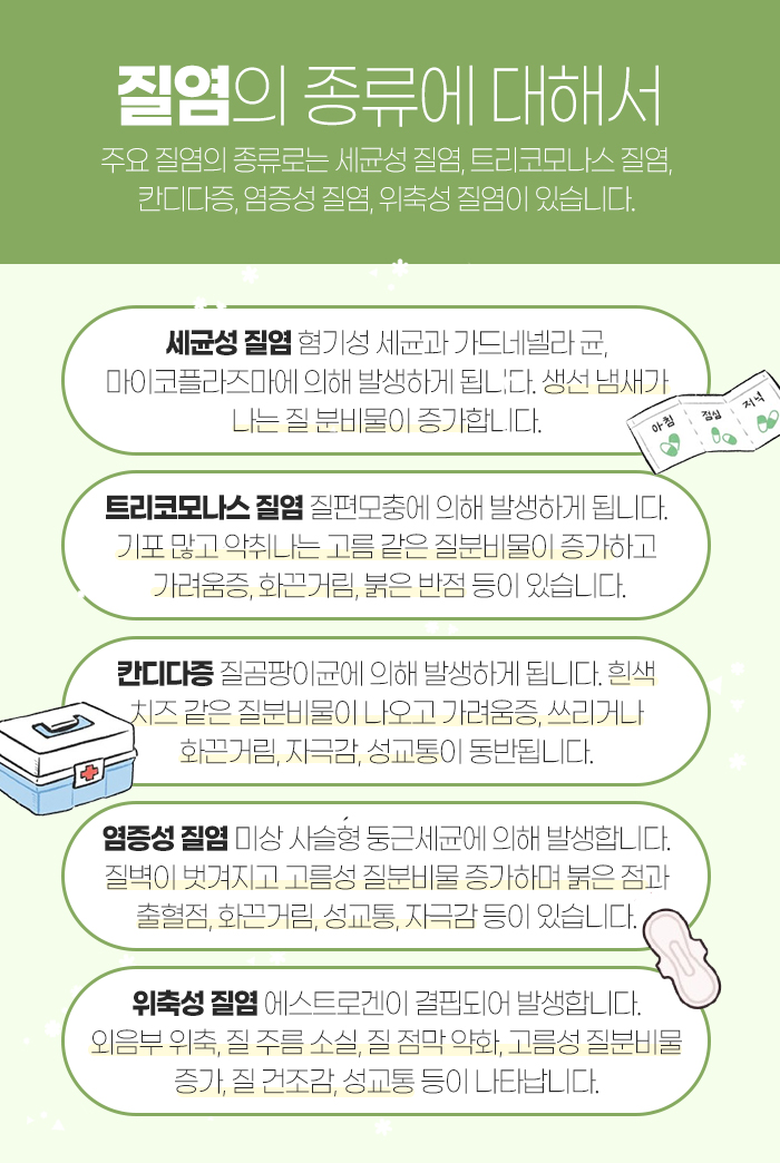 이처럼 질염이 발생하게 되는 원인도 다양하기 때문에 종류도 여러 가지가 있답니다. 세균성 질염과 트리코모나스 질염, 칸디다증, 염증성 질염, 위축성 질염이 있는데요.