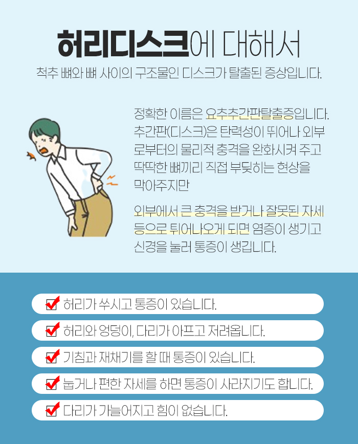 하지만 외부에서 크게 충격을 받게 되거나 잘못된 자세 때문에 튀어나오게 될 경우 염증이 발생하게 되면서 신경을 눌러 통증이 생기게 된답니다. 이렇게 허리디스크를 앓게 되면 허리가 쑤시고 통증이 있습니다. 또 허리와 엉덩이 다리가 아프고 저려오게 되는 등의 증상이 나타나게 되는데요.