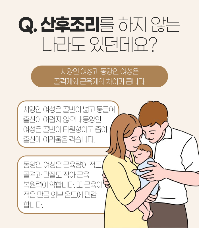 그리고 산후조리를 하지 않는 나라들도 있어서 굳이 산후조리를 해야 할까 생각하시는 경우도 있는데요. 우리가 스포츠 경기를 보면 서양인과 동양인의 골격 근육 차이를 느끼는 것처럼 이는 출산에도 적용된답니다.