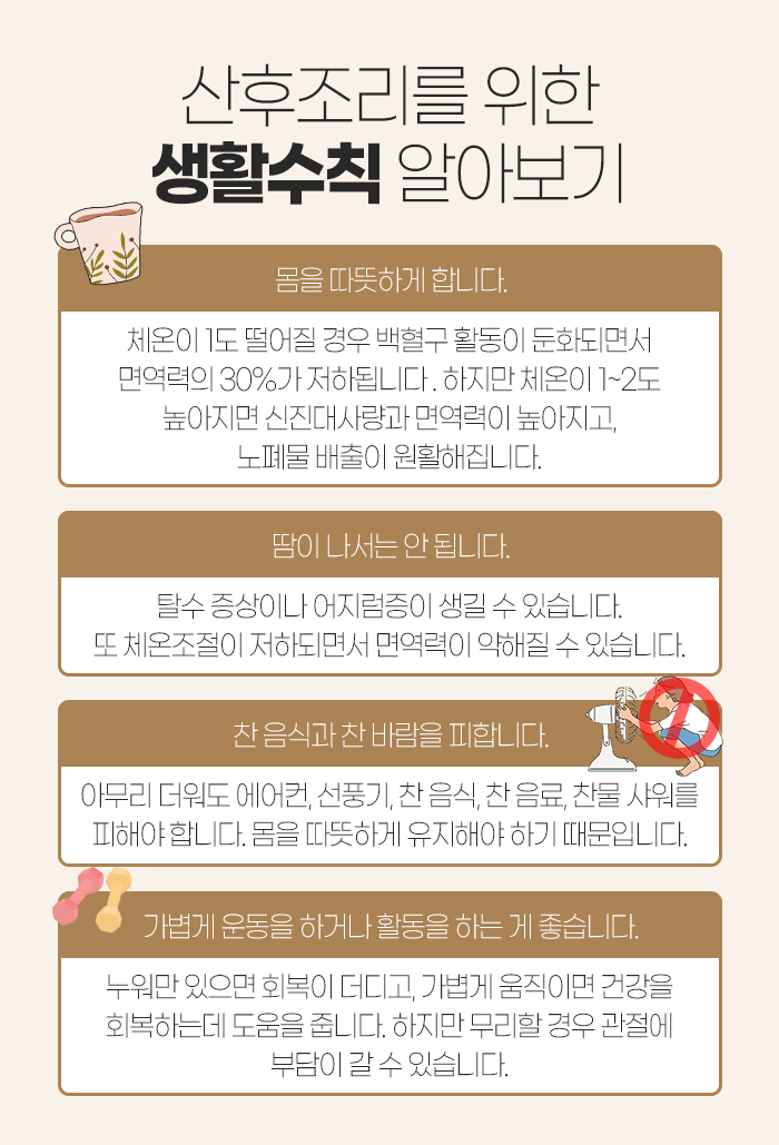 더워도 체온이 떨어지면 안 되기에 에어컨이나 선풍기, 찬 음식 등을 피하셔야 합니다.