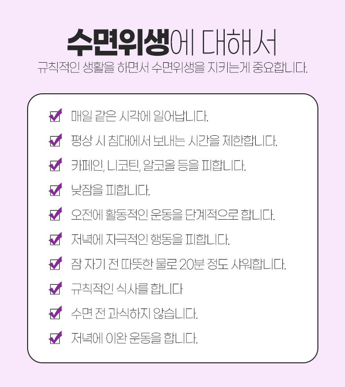 그리고 수면 위생에 대해서 이야기를 하자면, 매일 같은 시간에 일어나는 것과 평상시 침대에서 보내는 시간을 제한하는 것, 카페인과 니코틴 및 알코올 등을 피하는 것, 낮잠을 피하는 것, 오전에 활동적인 운동을 단계적으로 하는 것, 저녁에 자극적인 행동을 피하는 것,